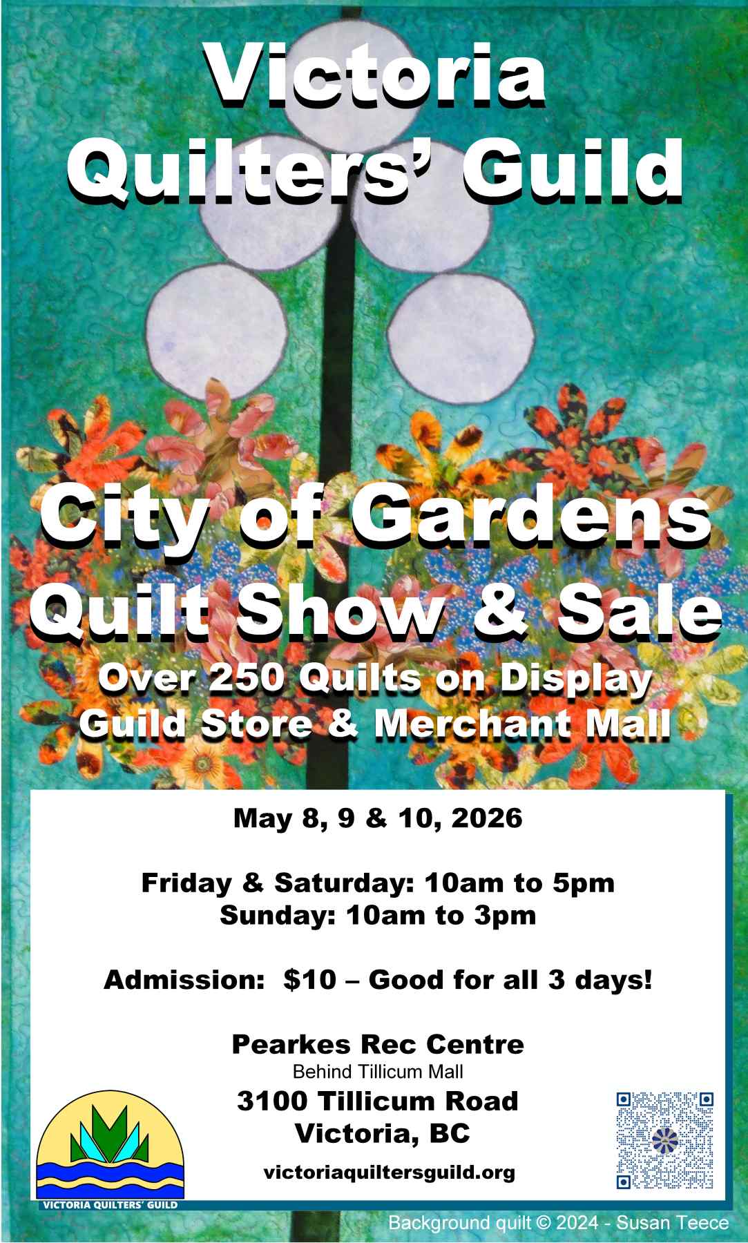 Raffle Tickets are now available. Fundraising Tickets are 3 for $5.00 – draw date is May 10th, 2026, at 2 p.m.at the VQG’s City of Gardens Quilt Show & Sale on May 8th, 9th and 10th, 2026